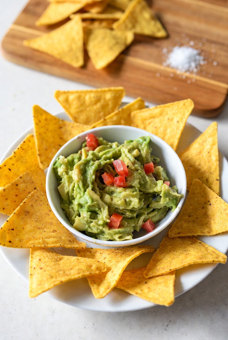 - Tradicionalne nachos z guacamole – Klasyczna wersja z nachos i guacamole, idealna na wieczory filmowe.